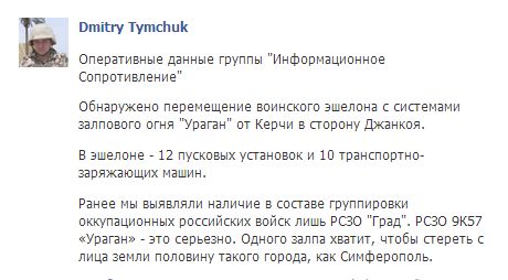 Как заявил журналист Дмитрий Тимчук, в сторону Джанкоя русские перебрасывают системы залпового огня "Ураган".