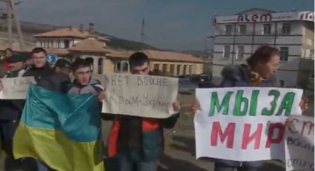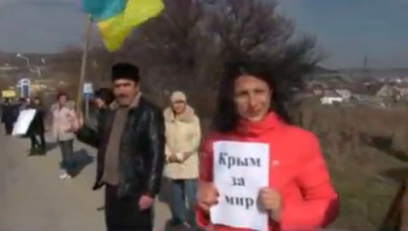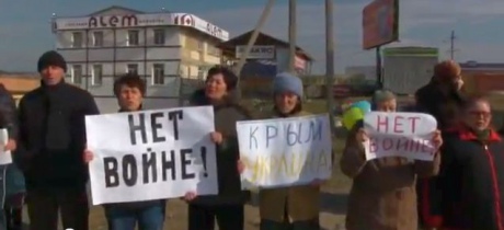 Они держат в руках плакаты "Нет войне", "Крым – за мир", "Нет референдуму", призывы к солдатским матерям из России забрать своих детей из Крыма.