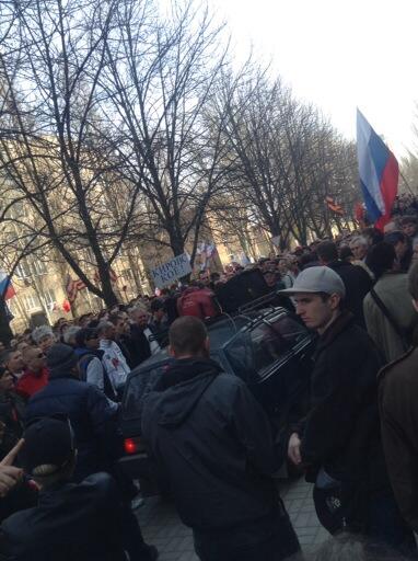 Над площадью - российские триколоры, георгиевские ленты и флаги "Донецкой республики". Люди скандируют: "Донбасс - Россия", "Тарута - прочь", "Беркут", Ахметов - враг народа " и "Губарев" и другие.