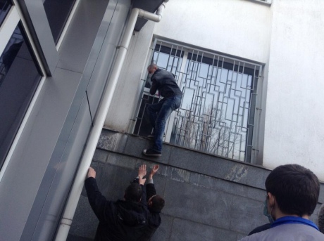Позже ко входу к СБУ подогнали машину, на крыше которой аудиотехника. Активисты скандируют "Путин помоги!". Двое митингующих залезли на здание облуправления.