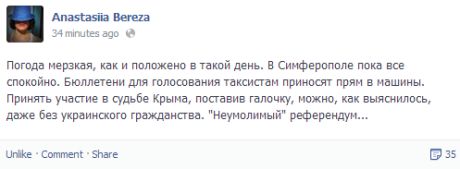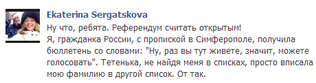 "Референдум считать открытым! Я, гражданка России, с пропиской в Симферополе, получила бюллетень со словами: "Ну, раз вы тут живете, значит, можете голосовать", - написала она.
