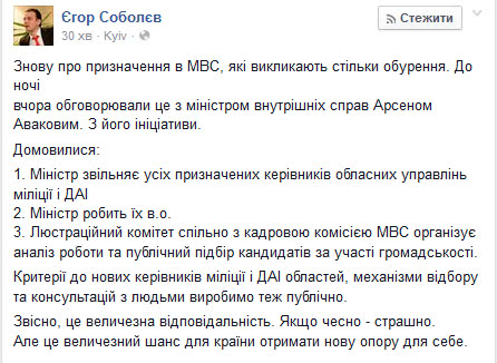 Глава МВД также сообщил в своем Facebook, что по предложению Соболева в процедуре со стороны Люстрационного комитета будут участвовать от журналистского цеха Юрий Бутусов, от правозащитных организаций Евгений Захаров.