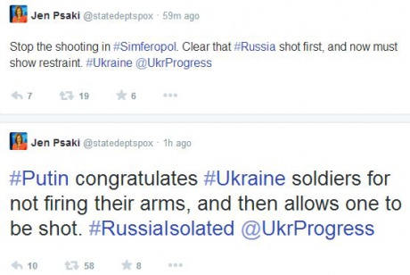 "Прекратите стрелять в Симферополе. Ясно, что Россия стреляла первой и сейчас должна продемонстрировать сдержанность", - написала Jen Psaki в Твиттере.