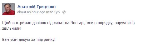Об освобождении заложников сообщил и депутат Верховной Рады Анатолий Гриценко на своей странице в Facebook. Его сын, активист Автомайдана Алексей Гриценко, был среди людей, задержанных представителями самопровозглашенной "власти Крыма".