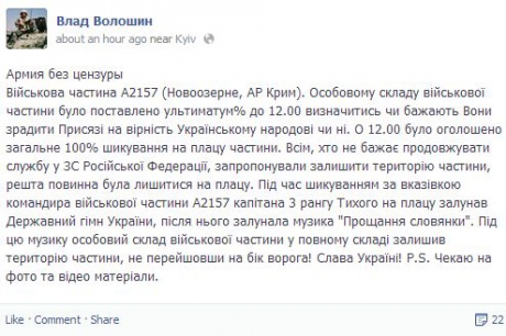 "Военная часть А2157 (Новоозерное, АР Крым). Личному составу военной части был поставлен ультиматум: до 12.00 определиться, желают ли Они предать Присягу на верность Украинскому народу или нет", - написал он.