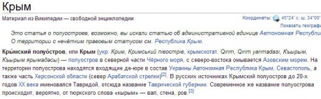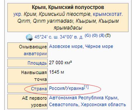 Между тем, в российской версии Wikipedia по состоянию на 20 марта Крым называется просто полуостровом в Черном море, а его принадлежность обозначена через черточку: Россия/Украина.