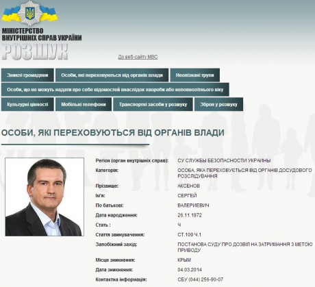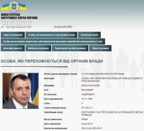 Самопровозглашенного премьер-министра Крыма Сергея Аксенова и главу нелегитимной Верховной Рады Крыма Владимира Константинова объявили в розыск.