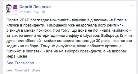 "Избиратель Кличко очень нестабилен, почти половина - молодежь до 30 лет, которая плохо ходит на выборы. Поэтому не удивляйтесь, если увидите фамилию "Кличко" в бюллетене - но не на выборах президента, а на выборах мэра Киева" , - написал Лещенко.