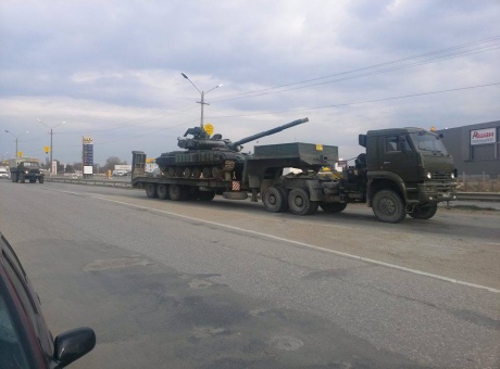 "Источники сообщают, что в настоящее время (в 16:00) в направлении на север Крыма движется колонна из 10 тралов РФ, на которых перевозят танки Т-64б из состава 36 бригады береговой обороны (Перевальное) колонна идет в сопровождении авто ГАИ и ВАИ", - написал он на своей Facebook-странице.