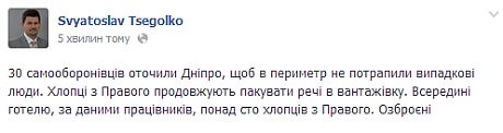 "В гостинице "Днепр" началась эвакуация. "Правый сектор "поспешно эвакуирует рюкзаки, их складывают в грузовик. Персонал отеля очень напуган. Руководитель информотдела Береза Борислав говорит стрелка у "Мафии" передали милиции. Появились автоматчики с надписью милиция", - написал на Facebook журналист.
