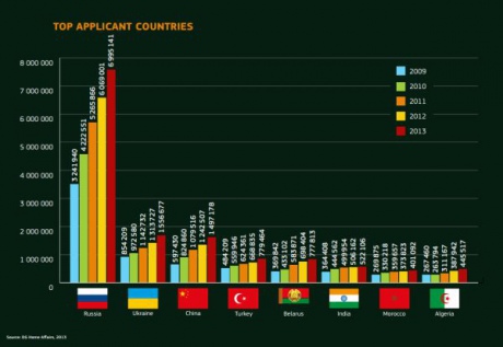 В 2013 году всего была подана 17 млн. 204 тысячи 391 анкета от неграждан Европейского союза. Из них, была выдана 16 млн. 139 тысяч 701 виза.