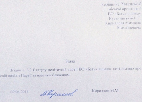 Накануне депутат Ровенского областного совета Михаил Кириллов тоже заявил о выходе из "Батькивщины".