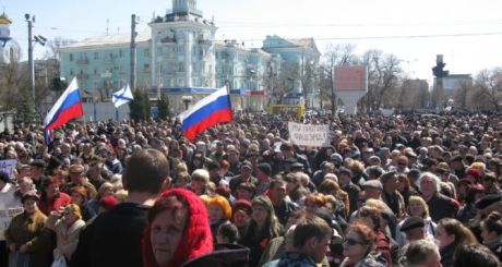 Собравшиеся выступают за отставку новой центральной власти, присвоение русскому языку статуса второго государственного, а также освобождения заключенного лидера "Луганской гвардии" Александра Харитонова.