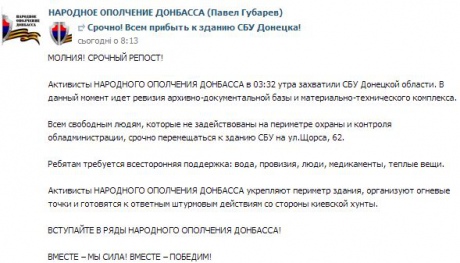 На странице "Народного ополчения Донбасса" Павла Губарева во Вконтакте ночью было заявлено: "Активисты Народного ополчения Донбасса в 03:32 утра захватили СБУ Донецкой области. В данный момент идет ревизия архивно-документальной базы и материально-технического комплекса".