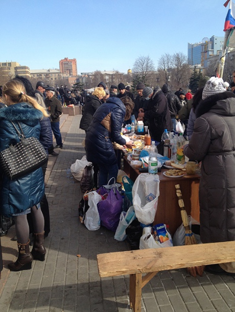 Как сообщает "ОстроВ", по состоянию на 9:40 под стенами здания ДонОГА было около 150 человек, многие из которых вооружены палками, битами и щитами, отнятыми в воскресенье у охранявших админздание сотрудников милиции.
