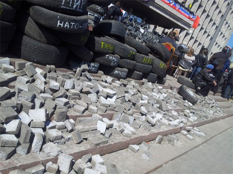 Там, где ранее стояли солдаты внутренних войск, сейчас возведены баррикады из покрышек, мешков с песком, столов, колючей проволоки, поломанных карнизов и других подручных материалов.