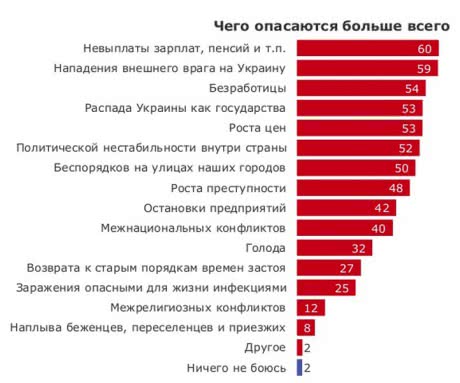 Кроме того, 50% опасаются беспорядков на улицах, 48% обеспокоены возможным ростом преступности. 40-42% считают возможными остановку предприятий и межнациональные конфликты. 32% даже предполагают, что в стране может быть голод.