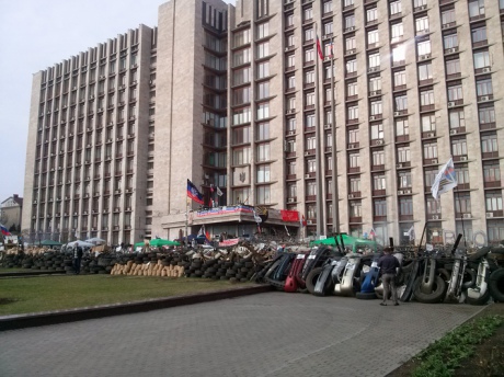 Пророссийские сепаратисты, занявшие Донецкий облсовет, по состоянию на 8 утра 10 апреля продолжают укреплять баррикады по периметру здания и обустраивать свой быт.