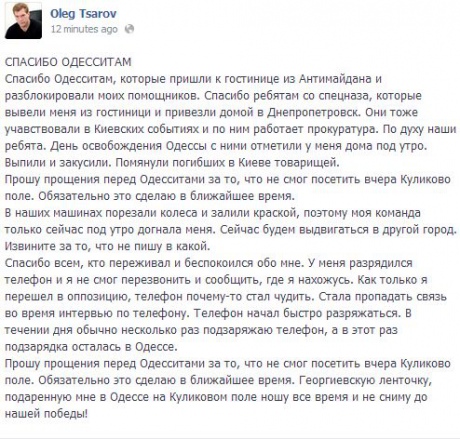 "Спасибо Одесситам, которые пришли к гостинице из Антимайдана и разблокировали моих помощников. Спасибо ребятам со спецназа, которые вывели меня из гостиници и привезли домой в Днепропетровск. Они тоже участвовали в Киевских событиях и по ним работает прокуратура. По духу наши ребята", - написал Царев.