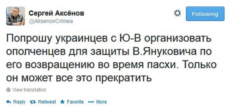 "Попрошу украинцев с Северо-Востока организовать ополченцев для защиты Януковича после его возвращения во время Пасхи. Лишь он может все это прекратить", - говорится в сообщении в Твиттере Аксенова.