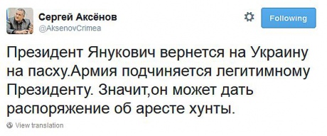 В то же время назначенный президентом России в. о. главы непризнанной Республики Крым Сергей Аксенов в своем твиттере подтвердил, что Янукович на Пасху вернется в Украину.