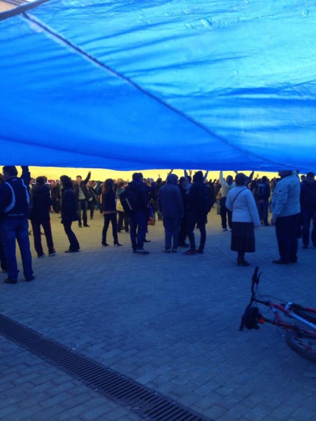 Люди держат госудасртвенные флаги. Кроме того, митингующие развернули огромный желто-голубой флаг.