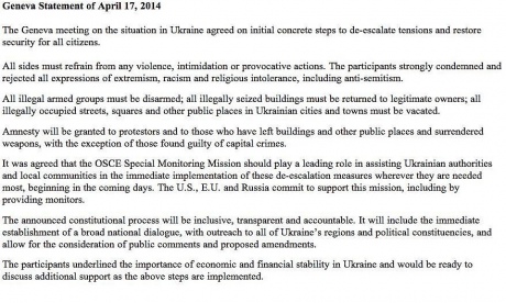 По итогам встречи Украина-ЕС-США-Россия был достигнут ряд договоренностей, в частности, об освобождении захваченных зданий в Украине и амнистии протестующих.