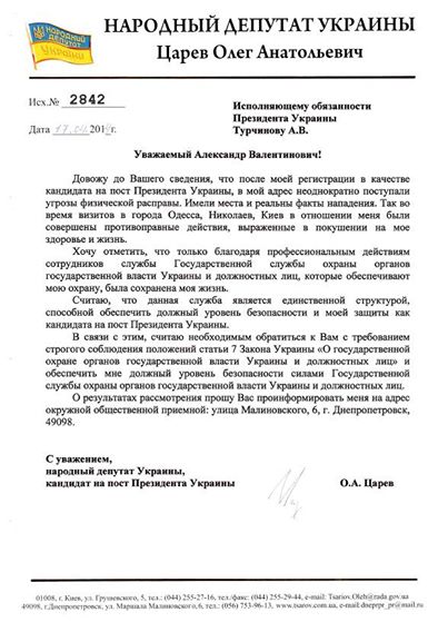"В ответ на мое вчерашнее обращение обеспечить госохрану ребята, которые были закреплены за мной (в рабочем порядке), 15 апреля после покушения на мое здоровье и жизнь получили команду вернуться в Киев и отправились на поезд", - пожаловался Царев.