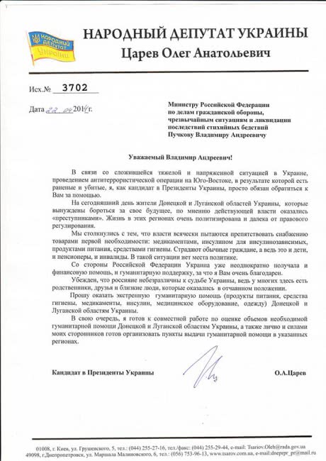 "В связи со сложившейся тяжелой и напряженной ситуацией в Украине, проведением антитеррористической операции на Юго-Востоке, в результате которой есть раненые и убитые, я, как кандидат в Президенты Украины, обращаюсь к министру МЧС РФ Пучкову Владимиру с просьбой оказать экстренную гуманитарную помощь Донецкой и Луганской областям Украины", - сказано в обращении Царева.