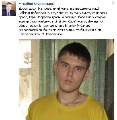 "К величайшему сожалению, подтвердились наши наихудшие опасения. Студент КПИ, факультета социологии и права, Юрий Поправко трагически погиб. Его тело со следами пыток было найдено в реке неподалеку от Славянска, Донецкой области вместе с телом депутата Виталием Рыбаком", - цитирует ректора Артем Стельмашов в Facebook.