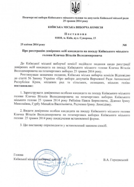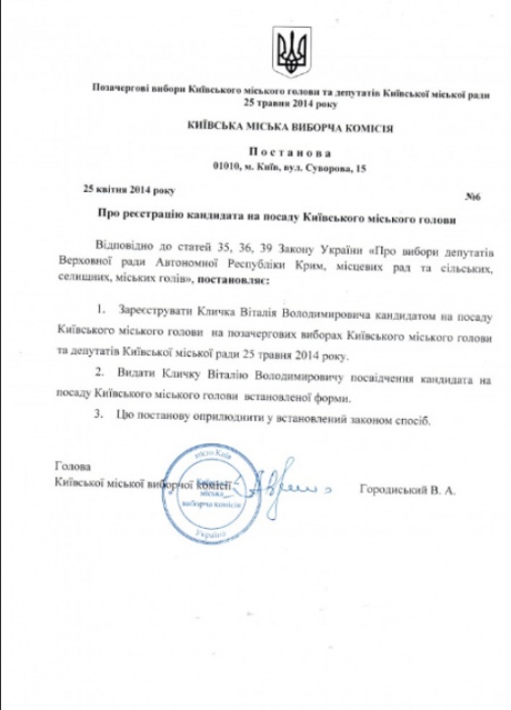 | Постановление о регистрации Кличко |