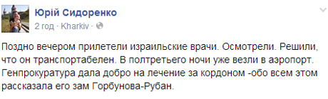 "Поздно вечером прилетели израильские врачи. Осмотрели. Решили, что его можно транспортировать", - сообщил он.