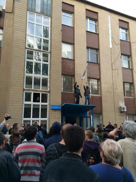 Проходя мимо административного здания "Донецкстали", толпа возмутилась тем, что над ним развивается украинский флаг.