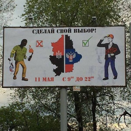 Между тем, на Донбассе на улицах размещена агрессивная агитация сепаратистов, в частности, очень подобная на риторику в Крыму накануне псевдореферендума в АРК.