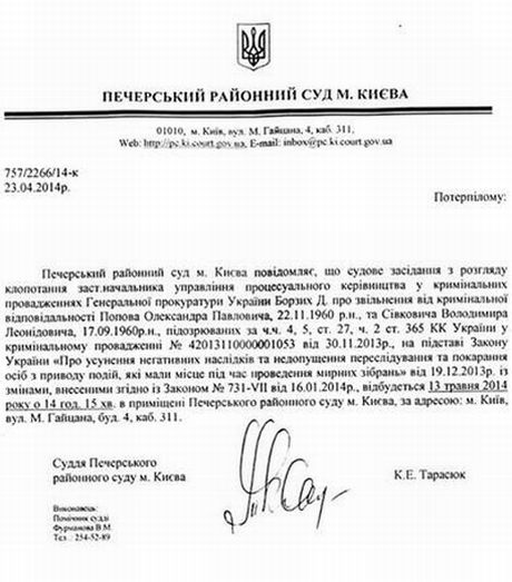 Заседание Печерского районного суда Киева по ходатайству в отношении экс-главы Киевской городской госадминистрации Попова и бывшего заместителя секретаря СНБО Сивковича назначено на 14:15 вторника, 13 мая, в кабинете №311.
