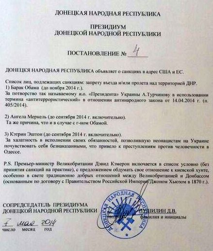 | Незаконная ДНР "запретила въезд" Обаме, Меркель и Эштон |