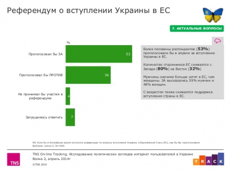 Кроме того, 53% граждан Украины поддержали бы вступление страны в Евросоюз на референдуме, а 36% по апрельским данным проголосовали бы против.