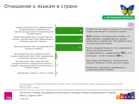 При этом 33% опрошенных TNS-Украина выступают за то, чтобы русский язык имел статус официального в ряде регионов.