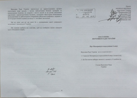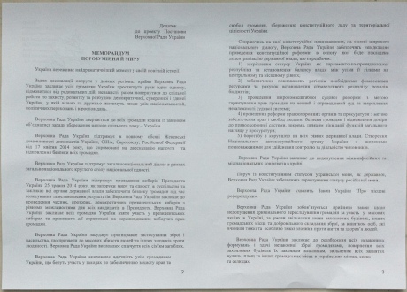 Депутаты приняли в целом проект Меморандума, поданный народным депутатом от ПР Вадимом Новинским с определенными поправками. В частности, были внесены пункты о содействии проведению выборов президента 25 мая.