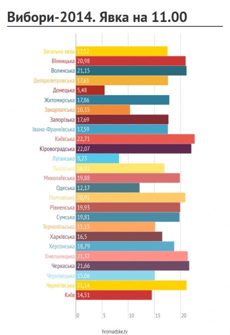 За його даними, станом на 11:00 явка виборців по Донецькій області становить 4,75% (дані вираховувались від кількості виборців, включених до списків виборців на відкритих виборчих дільницях).