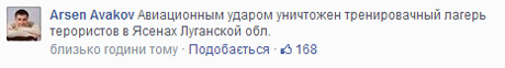 Подробности об этом в своем Facebook написал министр внутренних дел Арсений Аваков: " Авиационным ударом уничтожен тренировачный лагерь террористов в Ясенах Луганской обл.".