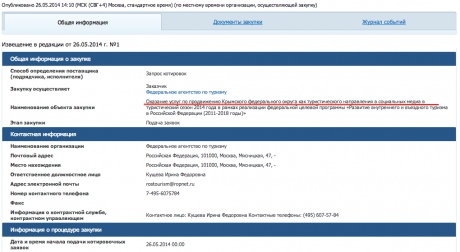 Контракт будет заключен на 4 месяца - с первого июня по 30 сентября 2014 года. Его начальная цена - 500 тысяч рублей (около 14,6 тысяч долларов).