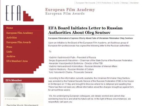 "Мы, его европейские коллеги, глубоко обеспокоены и не можем не волноваться за его судьбу и его будущее", - сказано в обращении звезд мирового кинематографа.