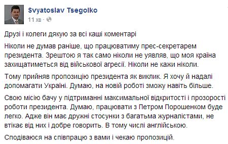 "Свою миссию вижу в поддержании максимальной открытости и прозрачности работы президента. Думаю, работать с Петром Порошенко будет легко. Ведь он имеет дружеские отношения со многими журналистами, не убегает от них и хорошо говорит. В том числе на английском", - подчеркнул Цеголко.