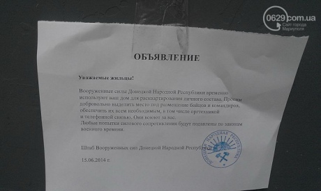 Согласно информации, в минувшую субботу на ряде жилых домов появились объявления, подписанные так называемым "штабом вооруженных сил" террористической организации "ДНР".