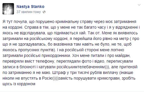 "Штраф в три тысячи рублей выплачу (иначе никогда не впустят в Россию). Вместо того, чтобы возбуждать уголовные дела, сделайте что-то с границей", - написала она на своей Facebook-странице.