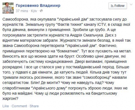 "Диск с отснятым материалом забрали. Журналисты снимали беспорядок, в который так называемая Самооборона превратила "Украинский дом", - добавляет Горковенко.