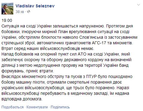 "Вследствие минометного обстрела и пусков с противотанковой управляемой ракеты была повреждена боевая машина пехоты, получили смертельные ранения двое украинских военнослужащих, еще трое были ранены. Сейчас военнослужащие находятся в медицинском учреждении, им оказана соответствующая помощь", - написал он на своем Facebook.