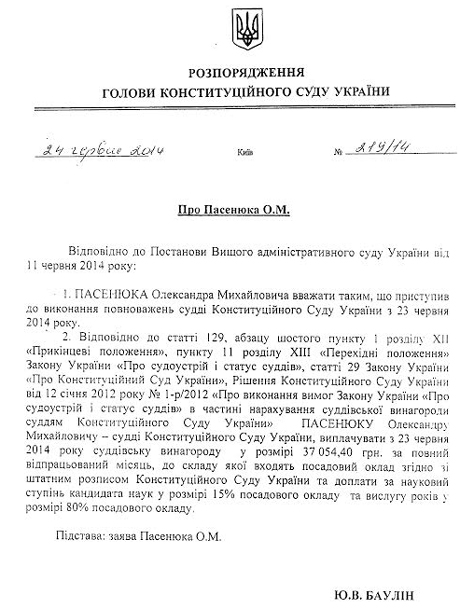 В распоряжении No 219/14 говорится о том, что Пасенюк приступил к исполнению полномочий судьи Конституционного Суда Украины с 23 июня 2014 года.