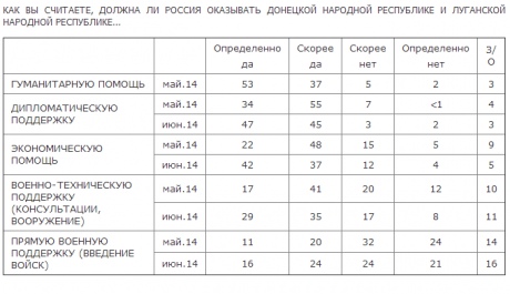 Так, отвечая на вопрос, должна ли Россия оказывать "Донецкой народной республике и Луганской народной республике…" военно-техническую поддержку (консультации, вооружение), 64 % ответили утвердительно (29% - определенно да, 35 – скорее да).